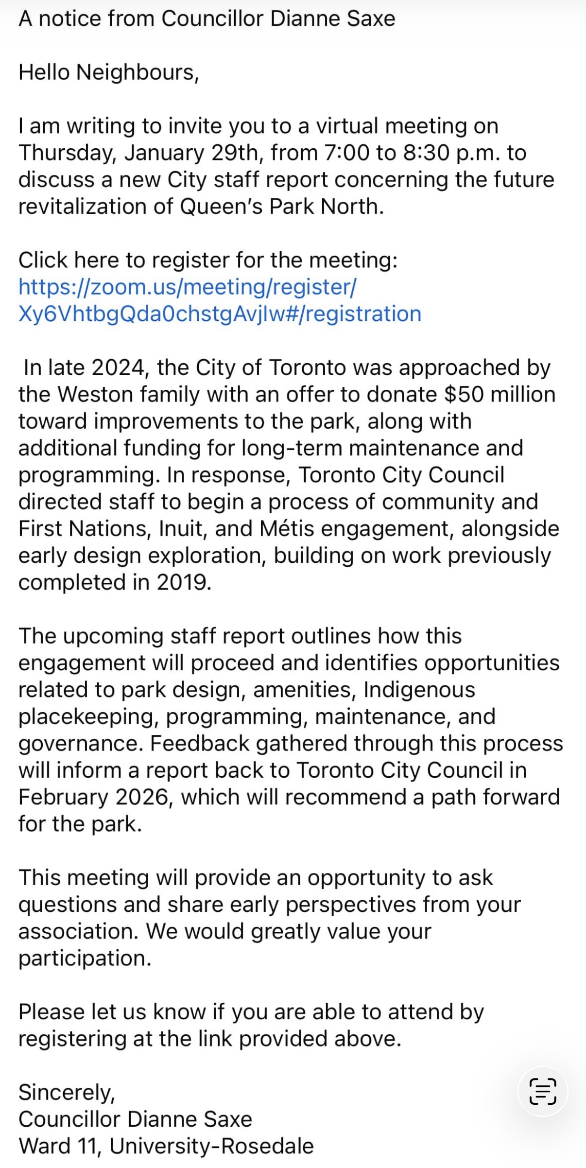 Join us on Wednesday, January 28th for a Community Safety Town Hall, hosted in partnership with parents from Jean Lumb Public School and Bishop MacDonnell Catholic School. This is your chance to help shape the future of our neighbourhood. We’ve been pushing forward real improvements, from establishing a Community Safety Zone and advancing traffic‑calming measures to resolving nearby encampments and bringing exciting upgrades to Canoe Landing, including two new Dog Off-Leash Areas. We want to continue our work together. The evening features a panel with Deputy Mayor Ausma Malik, MPP Chris Glover, City of Toronto staff, and community partners, followed by a Q&A... |